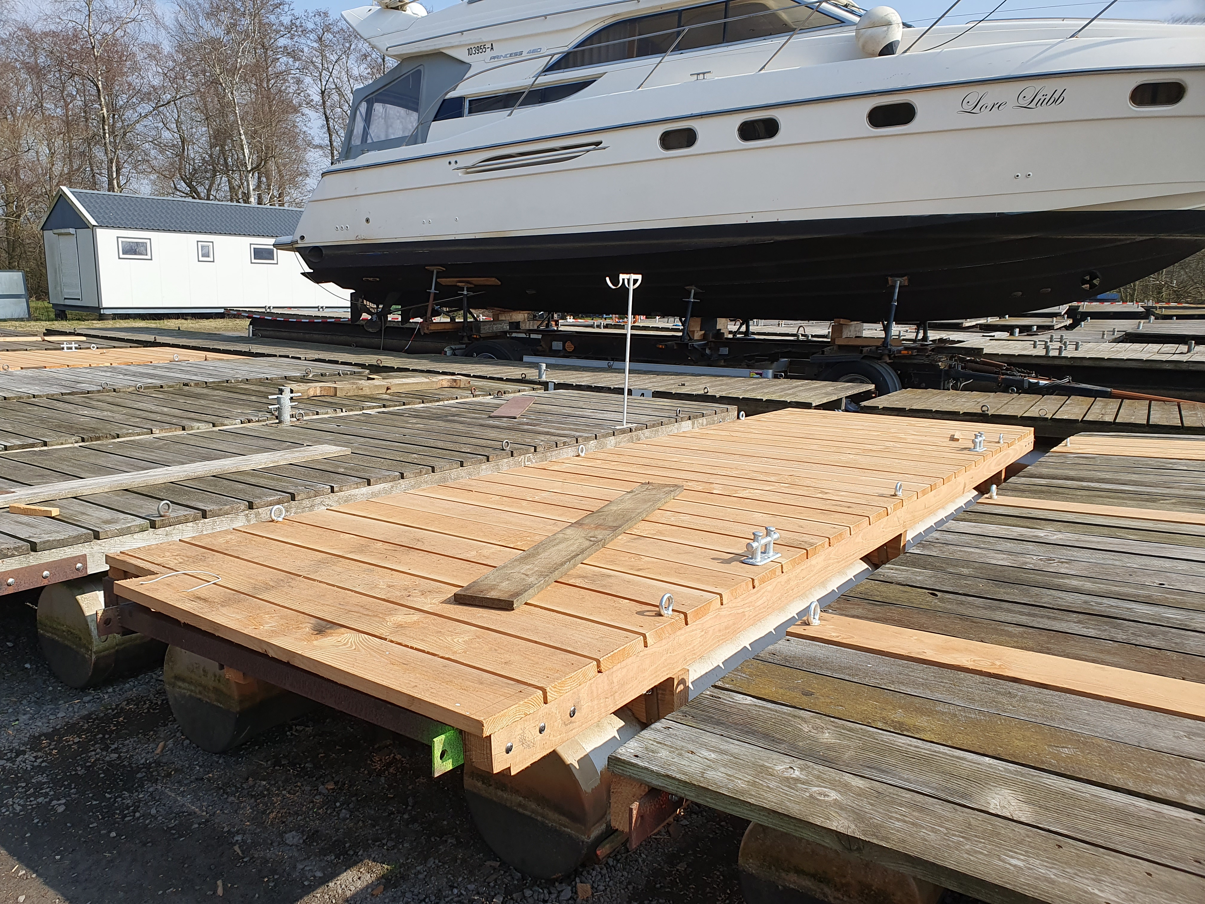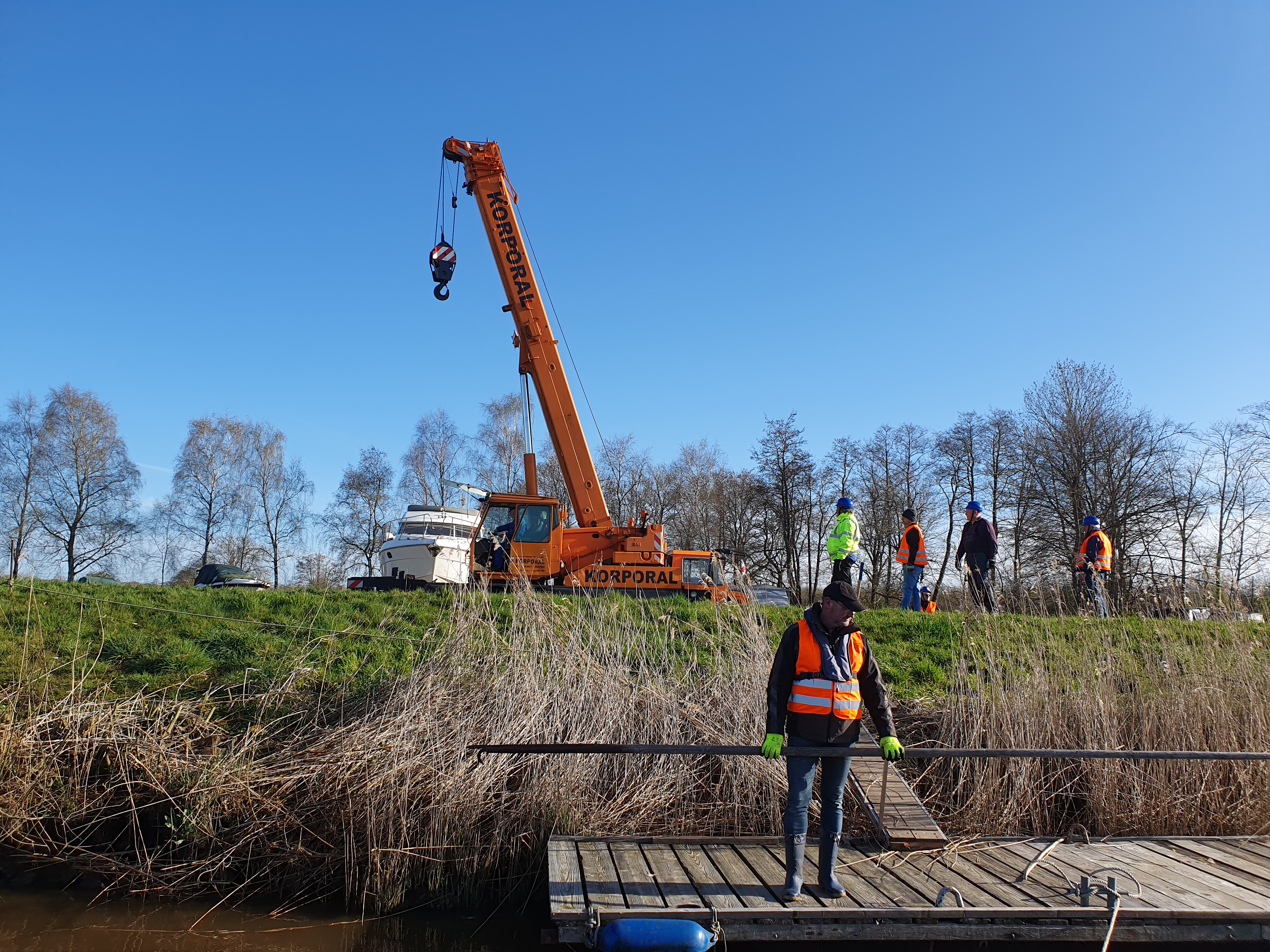 Stegekranen bei strahlend blauem Himmel Beide Stege liegen schon bereit zum Kranen