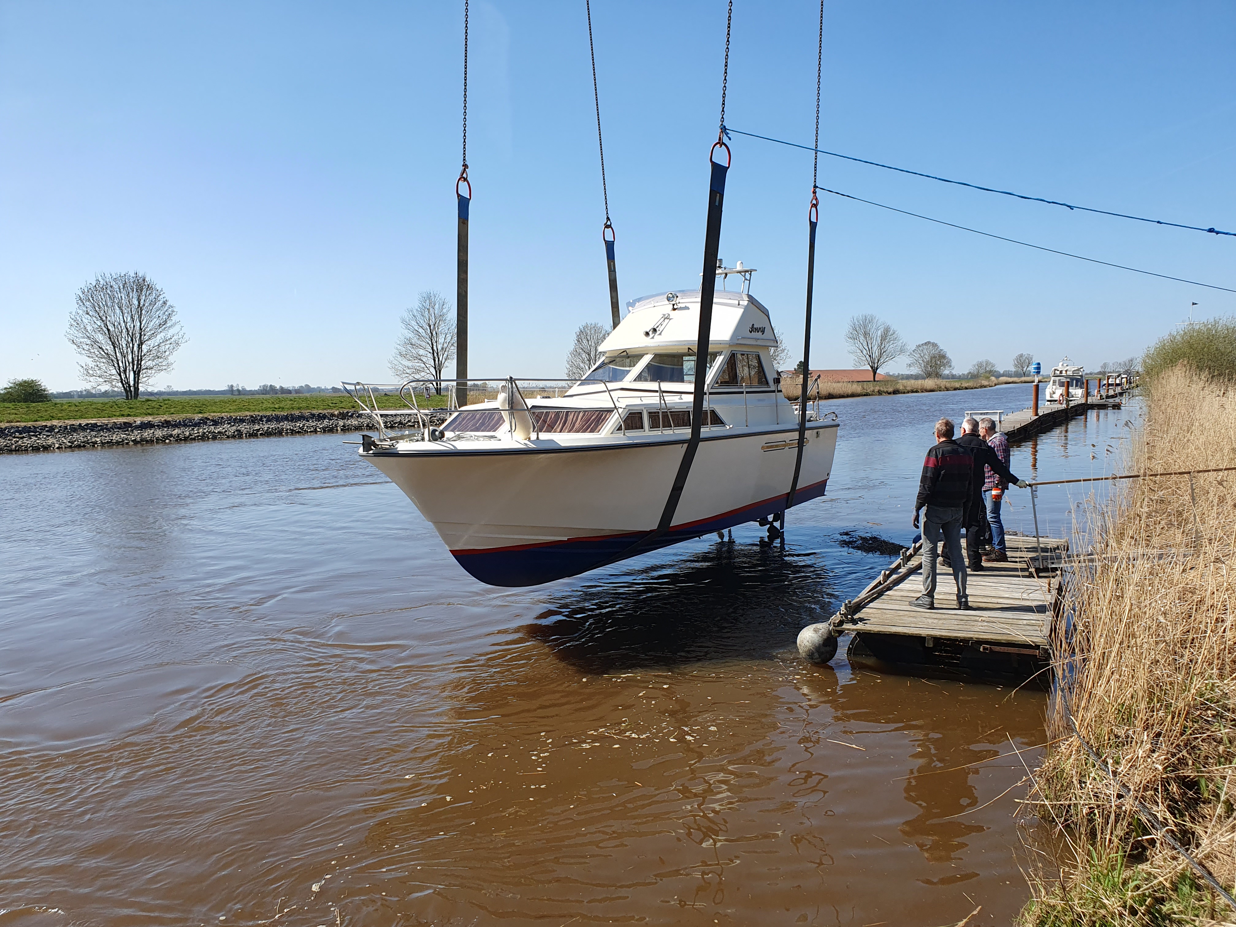 Jetzt folgt der Termin, auf den alle Bootseigner seit Anfang des Jahres entgegenfiebern. In mühseliger Arbeit sind die Boote während der Wintersaison wieder fit gemacht worden und werden jetzt mit einem großen Kran zu Wasser gelassen. Bei strahlendem Sonnenschein findet das Kranen statt. Alles läuft nach Plan.