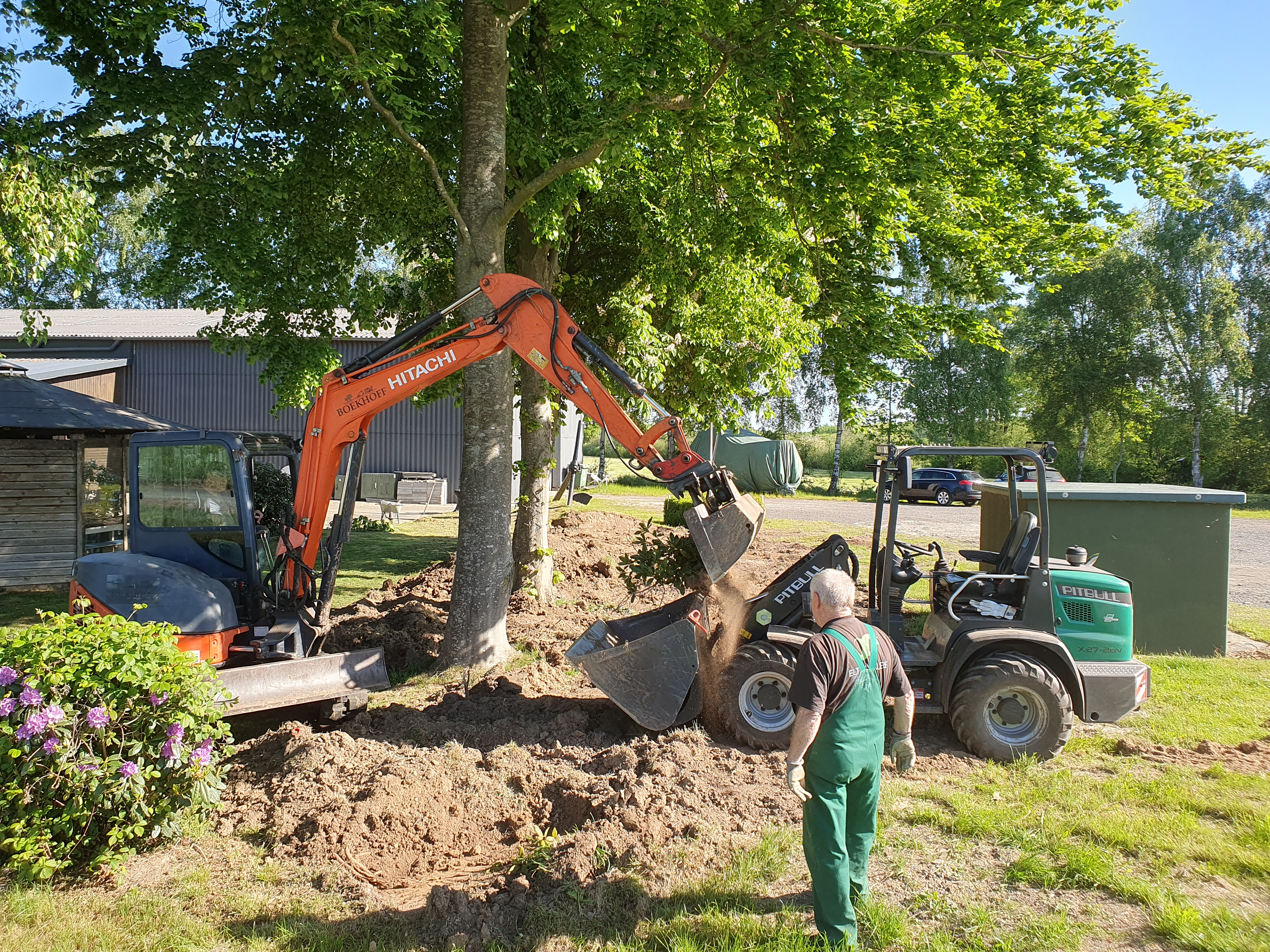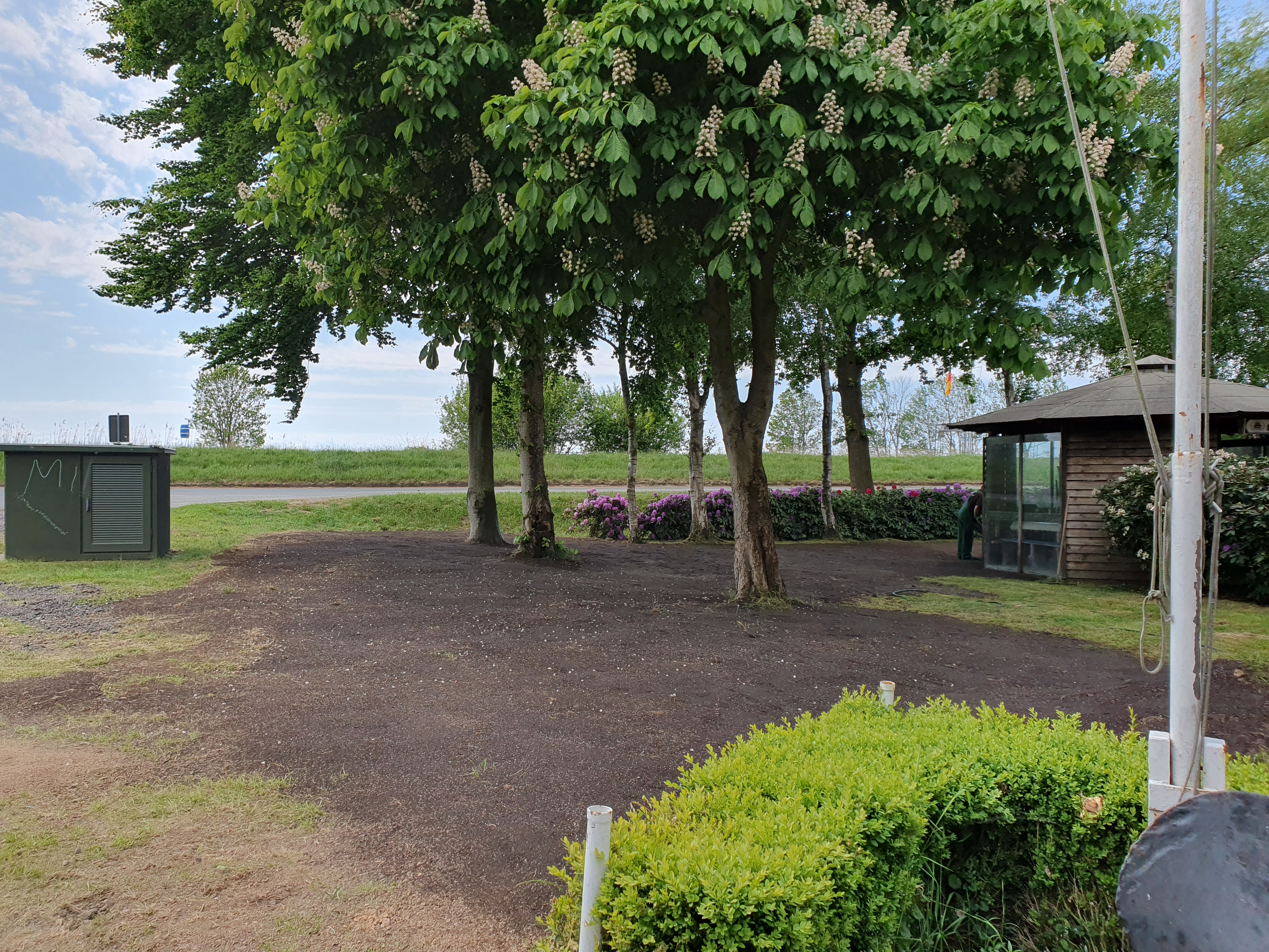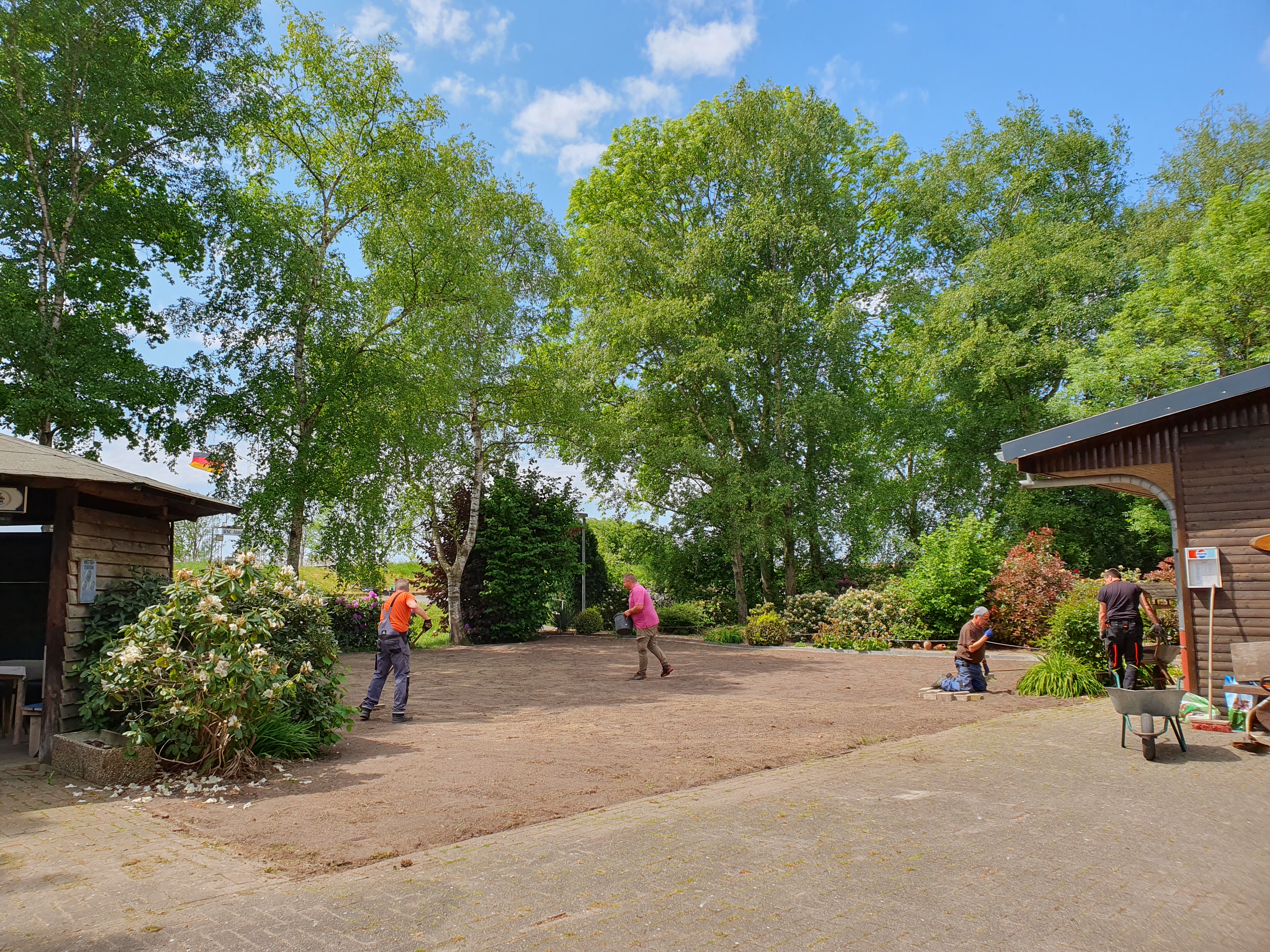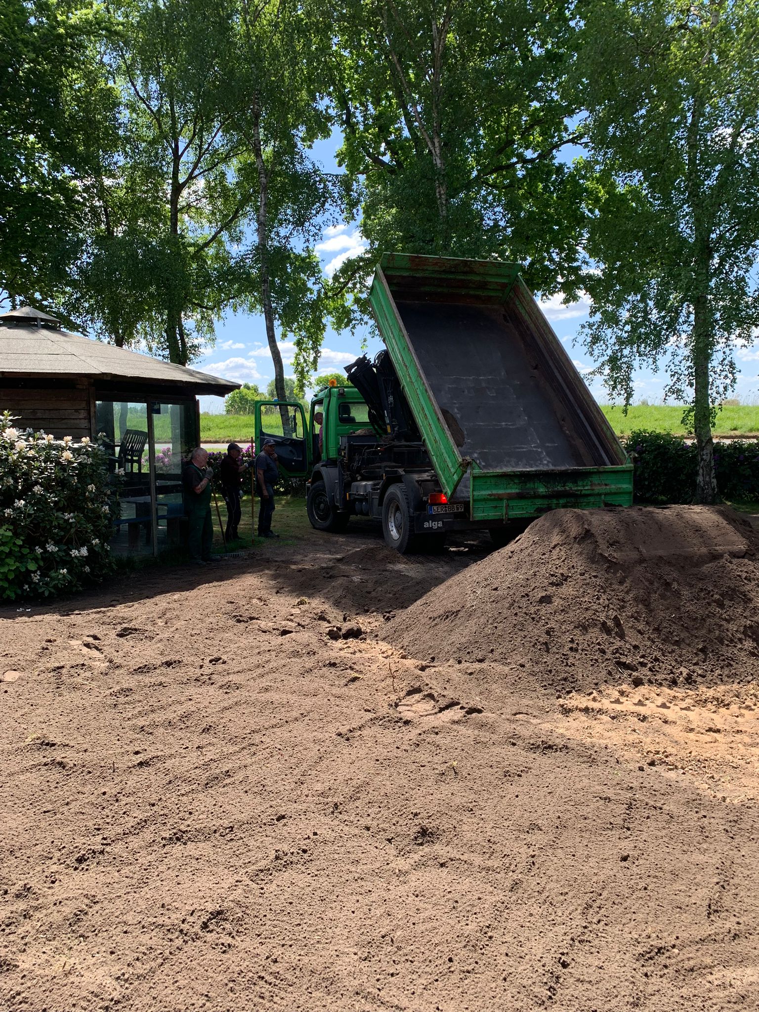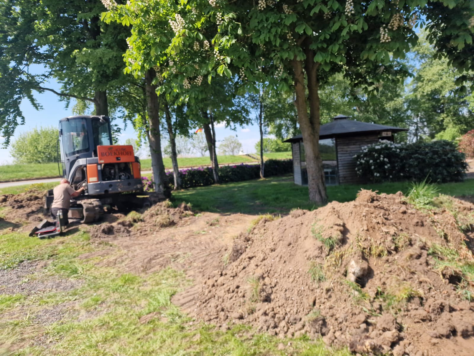 Einige Tage später beginnt eine Arbeitsgruppe damit, den Wall zwischen Schotterplatz und Pavillon mit schwerem Gerät zurückzubauen und die angrenzende Rasenfläche neu zu gestalten. Es werden dazu mehrere Ladungen Mutterboden verbaut.